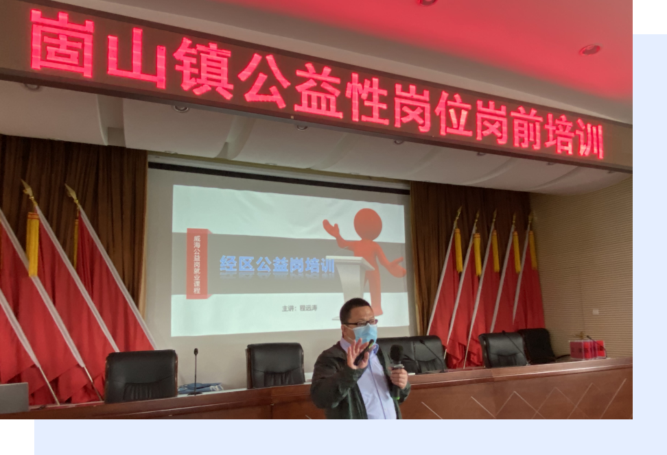 威海創業大學出動精英導師團隊對參訓人員進行授課,課程包含公益性崗位職責、公益性崗位分類、公益性崗位工作技能要求、提升你的溝通能力、提升你的團隊合作能力、鍛煉崗位技能的方法、個人綜合素質提升、模擬應用演練、實訓實操演練等“干貨”內容。